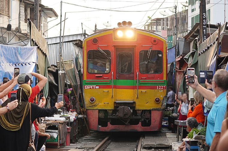 在泰國曼谷以西約70公里的『MAKELONG STATION』車站旁,小販們在營運的鐵路上賣菜,而就在一聲火車的笛聲響起,遠處一列火車緩緩駛來;大家就好像約好似的,不急不徐地收拾著自己的貨攤,一邊收起遮陽簾,一邊收起菜攤,讓您觀看市集攤販是如何隨著火車的來去,將攤位收放自如的獨特景觀,等待火車通過後,又以迅雷不及掩耳的速度,重新張開拉簾起攤,做生意了!