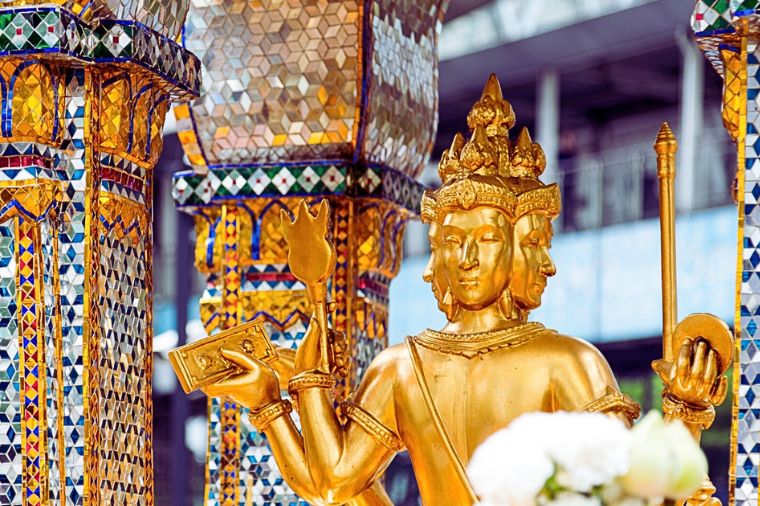 "遠近馳名的四面神ERAWAN,即是印度教三位一體神中的創造神-大梵天,所以該稱之為四面神,而非四面佛。四面神有四個面,四雙手和一雙脚,有脚的即是正面,從正面以順時針方向算起四個面分別代表:平安(手持佛珠)、事業(手持權杖)、婚姻(手持貝殼)、財富(手持金磚);也分別代表慈、悲、喜、捨四個字。