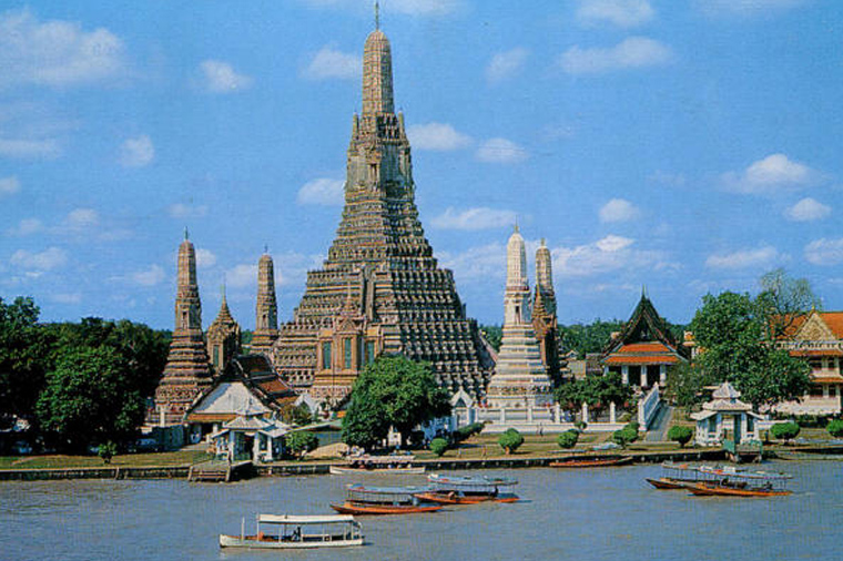 黎明寺(又稱鄭王廟、曉寺)是泰國規模最大的大乘舍利式塔,外觀潔白莊嚴,再加上鄭王廟就位於昭披耶河畔來往都會看到,地標代表性很強,也被網友稱是「泰國埃菲爾鐵塔」美譽。始建於泰國大城王朝時期,歷史相當悠久,是大城時期孟庫國王時代留下相當重要的文化遺產,其主塔高達82米以陶瓷片、玻璃等馬賽克方式鑲嵌,於日出與夕陽時分灑在佛塔上的光輝相當漂亮,不僅是10泰銖的硬幣背面的經典地標,更是泰國觀光局的 Logo 圖。