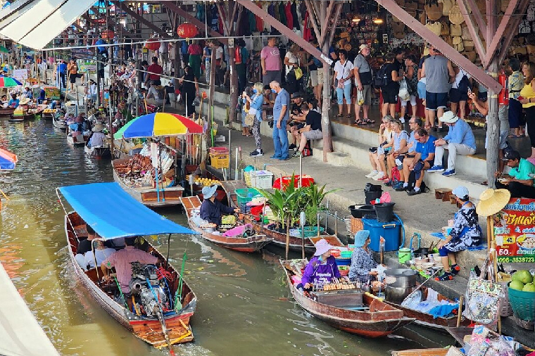 無論從那各角度觀賞這趟水上之旅,長方形彩色木筏載滿五顏六色水果、由戴著斗笠婦女搖槳緩前、錯落在綠色的運河上,這是東方威尼斯起源,也是歐美中外人士旅泰指標,是最接近泰人水上傳統生活型態的回顧;沿岸不妨一路吃喝買玩、小吃、水果。難怪泰旅遊局是年年推薦的行程。