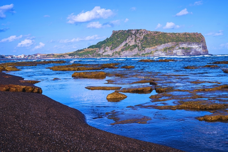 【城山日出峰】為漢拏山360個止火焰山之一,也是世界最大的突出於海岸的火山口,攀登30分鐘左右到達山頂;由此也可觀看日落,加上可以瞭望一片廣闊的牧場,美不勝收,令人嘆為觀止,遠眺這山峰綺麗景色。