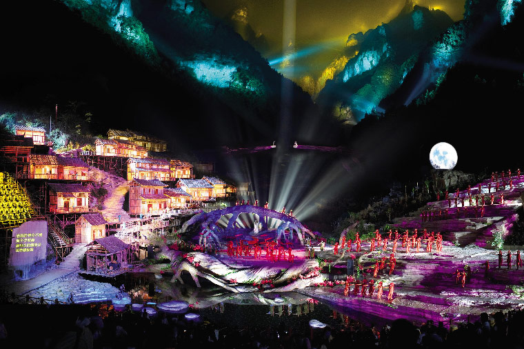 全劇共分五幕:狐王選妃、仙山奇遇、月夜相思、背叛旋風、千年守望,有一種愛情:為你而生;有一種誓言:生死相隨;有一種信仰:真愛無界;有一種堅持:只為你一人風情萬種夜幕降臨,月亮升起,偉岸神奇的天門山宛如一道天然屏風慢慢展開,變幻出另一種的奇幻絢麗...樂聲響起,霧嵐飛煙在奇峰間縈繞,飛瀑流泉在峽穀裏奔湧,花草樹木在翩翩起舞,100位銀飾盛裝的土家少女在歡快靈動的大自然中聲如天籟,講述著那被清風傳送了千年萬載的愛情故事。