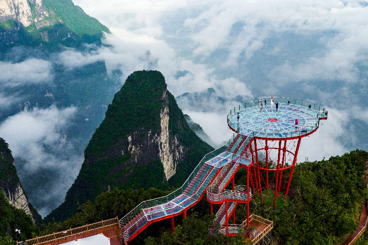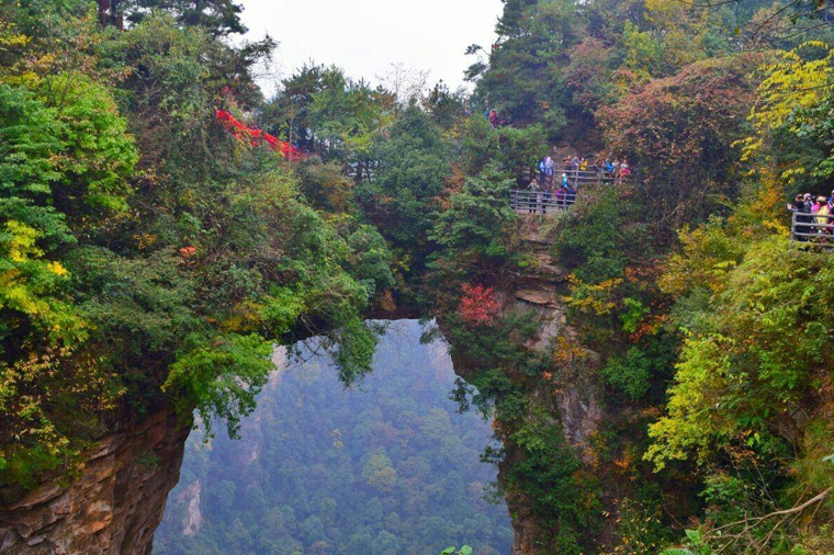 武陵源精華景點。大自然的鬼斧神工,將一塊厚約5米的天然石板,橫"架"在兩座山峰之上,把東西兩峰連接。高度、跨度和驚險均為天下罕見,故稱"天下第一橋"。在此貴賓們可以追尋電影”阿凡達”的潘朶拉星裏的空中山峰-哈利路亞山的場景,尋找著納美人的蹤跡。
