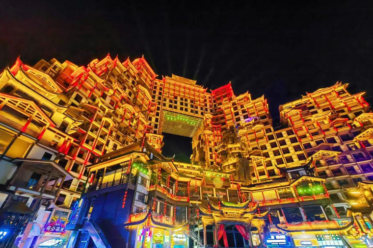 是張家界的一座高達109.9米的天宮奇樓。它不僅是張家界城市的新地標,更是中國土家族建築藝術的巔峰之作。遠眺之下,它宛如一座懸浮在空中的土家山寨,是目前世界上最高的吊腳樓建築。最令人著迷的是,它採用了全球最新的7D全息影像技術,並邀請國際一流的創作團隊,呈現出72種主題燈光表演,打造了張家界璀璨光影之都!