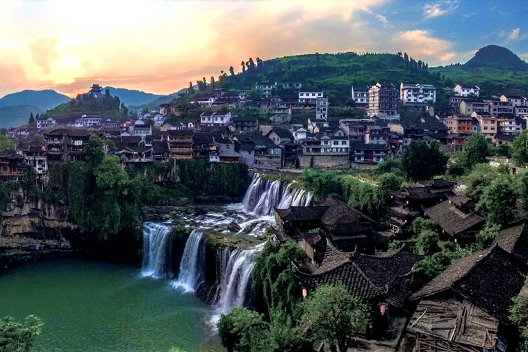 原名王村,曾是土司王的行宮,擁有兩千多年歷史,因電影《芙蓉鎮》在此取景拍攝而改名。芙蓉鎮三面環水,又有瀑布穿行其中,因此被稱為“掛在瀑布上的千年古鎮”。