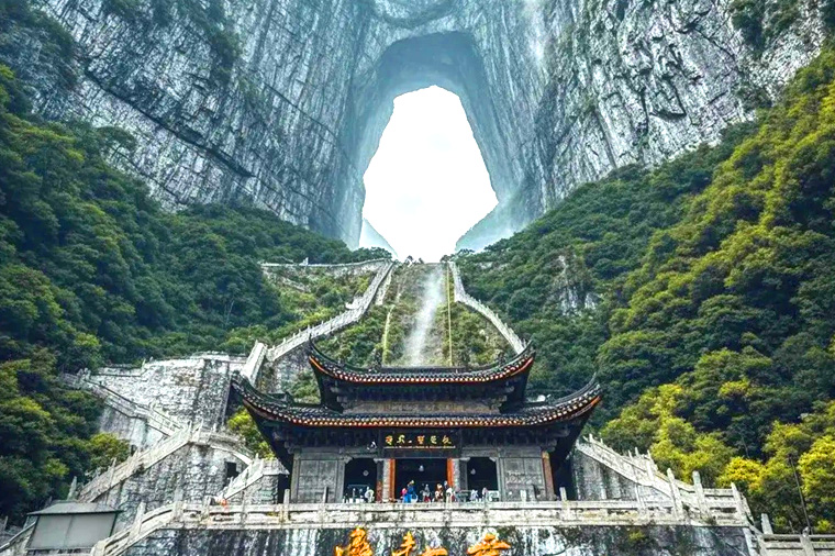 位於天門山山體的中上部,海拔1300米,門高131.5米,寬57米,深60米,是世界上最高海拔的天然穿山溶洞。天門洞南北對開於千尋素壁之中,似天門鑲嵌於天幕之上,終年吞雲吐霧。「天門洞開雲氣通,江東峨眉皆下風」,元朝的著名詩人張兌曾這樣讚嘆,磅薄的氣勢由此可見。