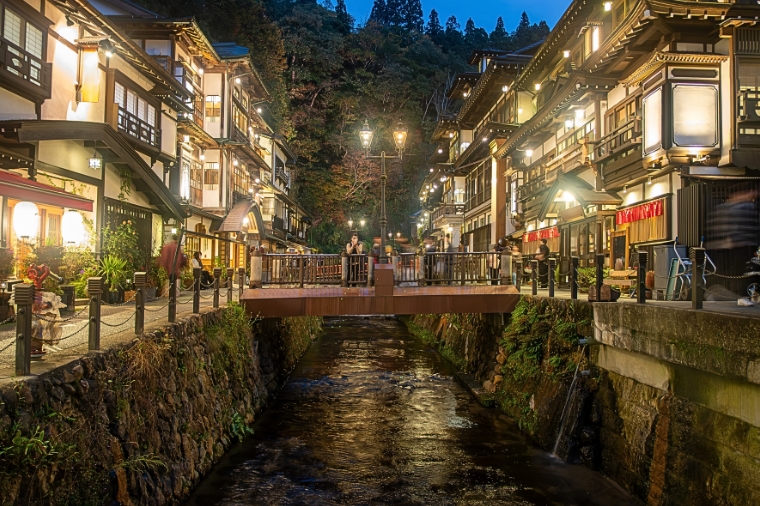【銀山溫泉街】因銀礦產地而得名的銀山溫泉,已有400年的歷史。沿著銀山川溪谷而建,河岸兩旁保留完整大正至昭和時期的木造老式旅館、石坂道、小橋、瓦斯燈,搭配潺潺水流,氣氛寧靜,宛如世外桃源。銀山溫泉因為拍攝著名電視劇「阿信」而風糜一時,劇中是阿信母親打工的地方,阿信因為想念母親也時常來到這裡。也由於受惠「阿信」而爆紅,因此被封為是「阿信的故鄉」。巧合的是,劇中阿信母親打工的溫泉旅館「能登屋」,傳說也是宮崎駿《神隱少女》動畫中繪製的油屋所參考的藍圖。讓我們就跟著阿信的腳步,一起進入宮崎駿的童話世界。