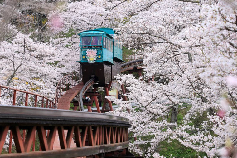 【日中線紀念自行車步行道】這條日中線紀念自行車步行道是過去鐵道日中線廢除過後重生而來的,每年四月中旬到下旬期間,鐵道兩旁的枝垂櫻滿開,便成為喜多方春天賞櫻的熱點,吸引大批的旅客前來賞花。位於福島縣喜多方的「日中線」自1984年廢線後修建成全長三公里的步道,搖身變為「日中線紀念自行車步行道」,並在步道兩旁種植了超過千顆的八重垂枝櫻,每年四月中旬開始陸續綻放到五月上旬,上千棵垂枝櫻夾道成一片粉紅色隧道,走在其中,垂櫻迎風搖曳的畫面夢幻不已,是喜多方非常受歡迎的賞櫻景點。