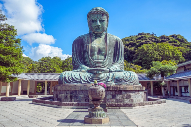 坐落高德院內,聳立在遊客面前。高12公尺,光是臉部就有2.3公尺,重達121公噸。從1238年開工,花費了6年的時間木雕大佛修建完工,到 1252 年開始修建為金佛。為現存鎌倉的佛像之中唯一的國寶;也因為日本歌人與謝野晶子的歌詠於是大佛也有「美男」的美稱。